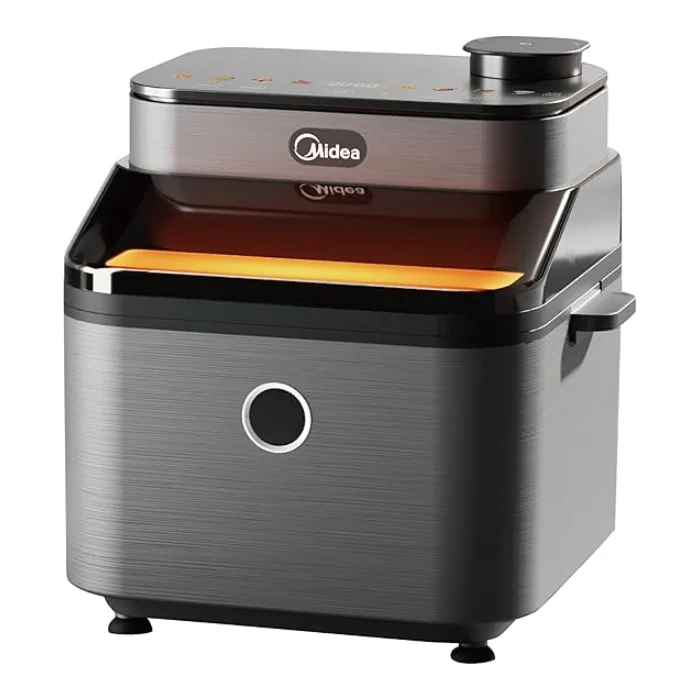 تتيح لك القلاية الهوائية ميديا 7 لتر المبتكرة إعداد بطاطا مقرمشة طازجة لذيذة مع ملعقة واحدة من الزيت، بالنسبة للمنتجات المجمدة فإنها لا تحتاج إضافة الزيت من خلال إحاطة الطعام بالحرارة ليطهي بالتساوي يوفر عنصر التسخين القوي الحرارة عن طريق الحمل الحراري لعملية طهي مثالية .